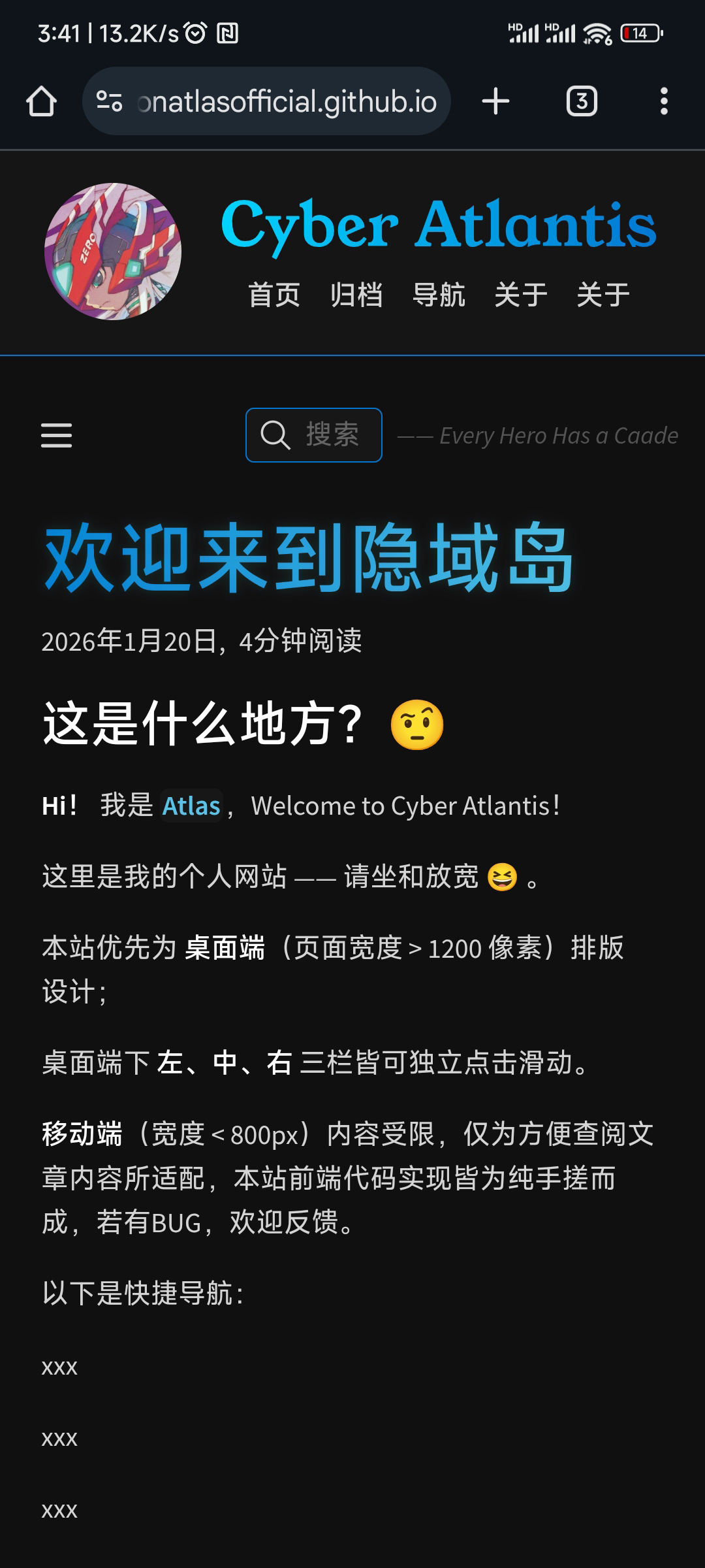 当前的顶栏(header布局)始终处于显示状态,我希望在页面开始下拉后,也就是正式阅读文章时,顶栏向上收缩消失,在返回页面顶部时再重新出现。(已放弃)移动端放置单独的目录栏按钮,可点击收纳?(已经不必要,且桌面端改造过大,屎山代码了已经…)