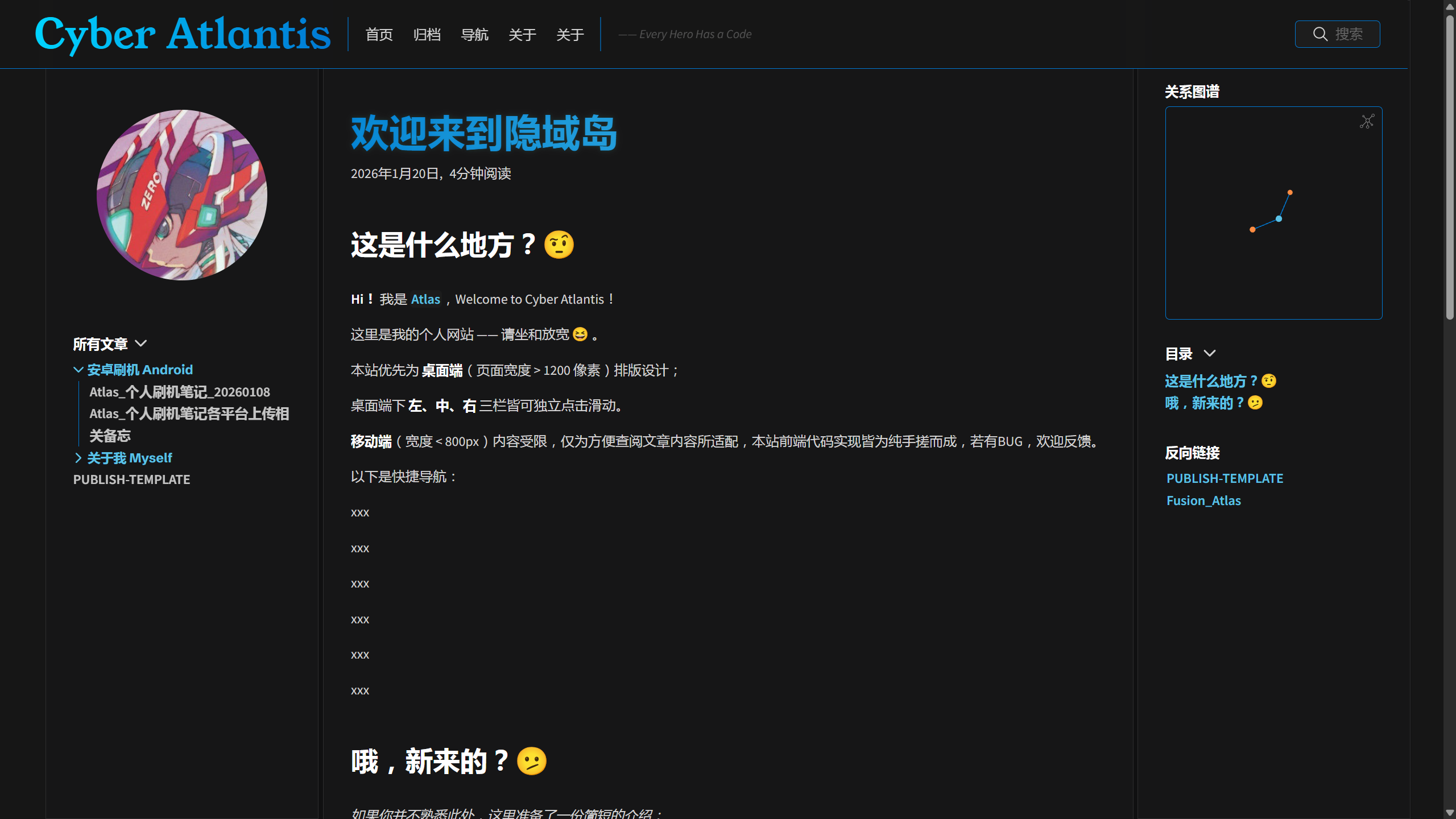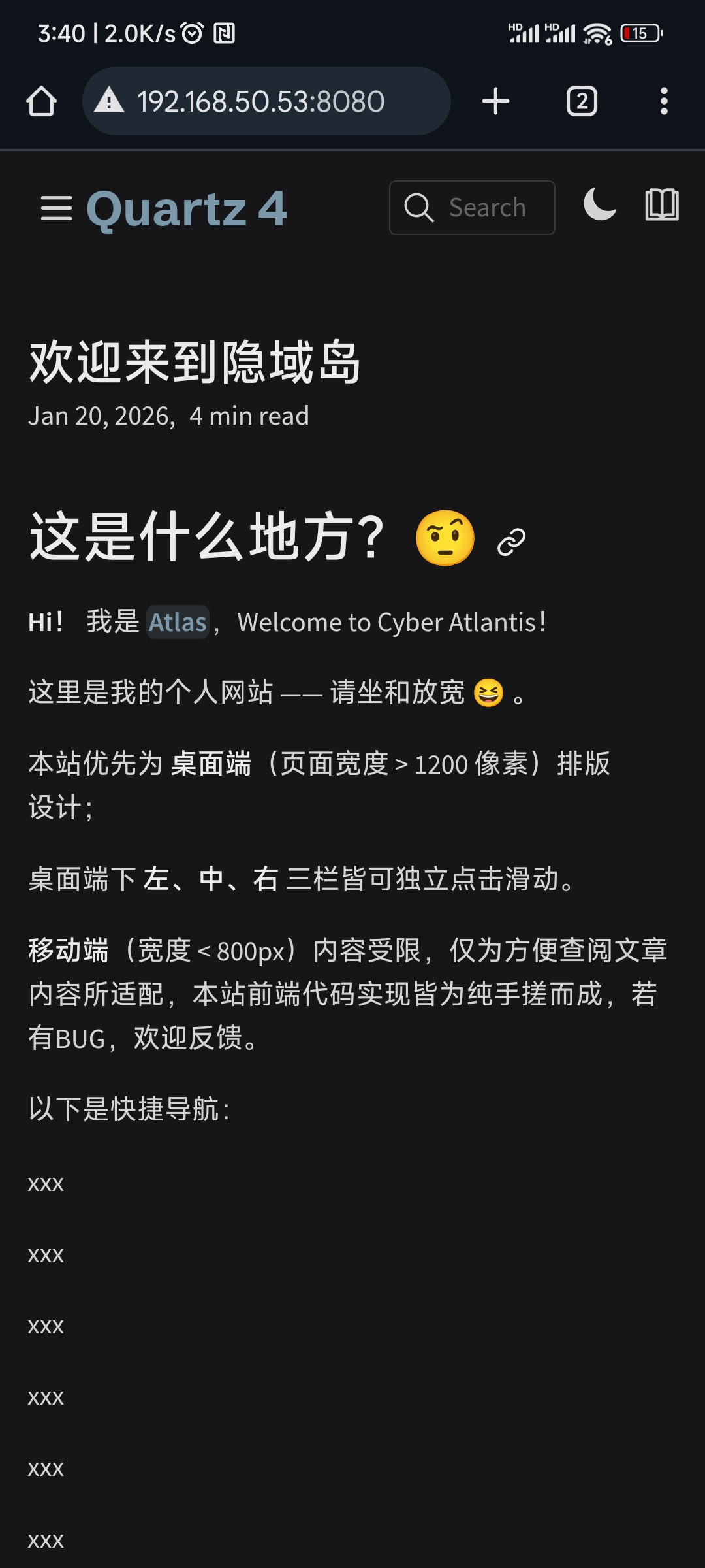 - Quartz 默认启用了客户端路由,点击链接时,网页不会整页刷新,而是像 App 一样平滑过渡。这在静态博客中极为罕见,极大提升阅读体验。